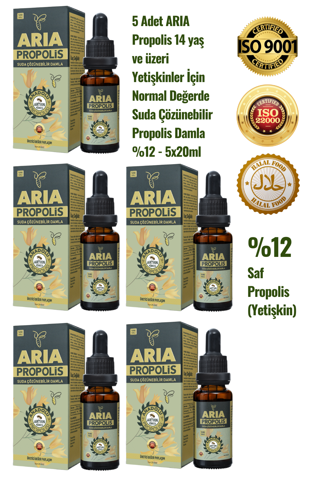 5 Adet ARIA Propolis Yetişkinler İçin Suda Çözünebilir Kafkas Arısı Propolis Damla %12 - 5x20ml